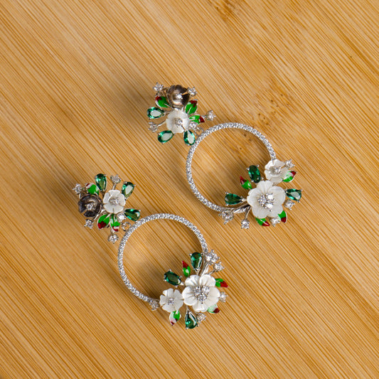 White Flower and Green Stone Earrings