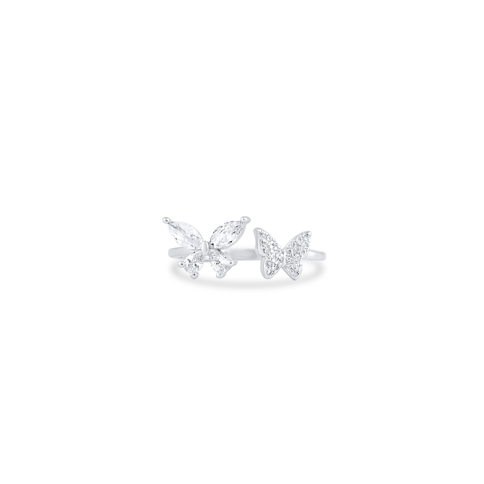 The Bloom & Fly Ring beautifully captures the grace of transformation. Crafted in 92.5 sterling silver, this dual-butterfly design shimmers with sparkling stones — one adorned with marquise cuts and the other with pavé brilliance. Symbolizing freedom and elegance, it’s the perfect ring to express your lighthearted spirit and refined style.