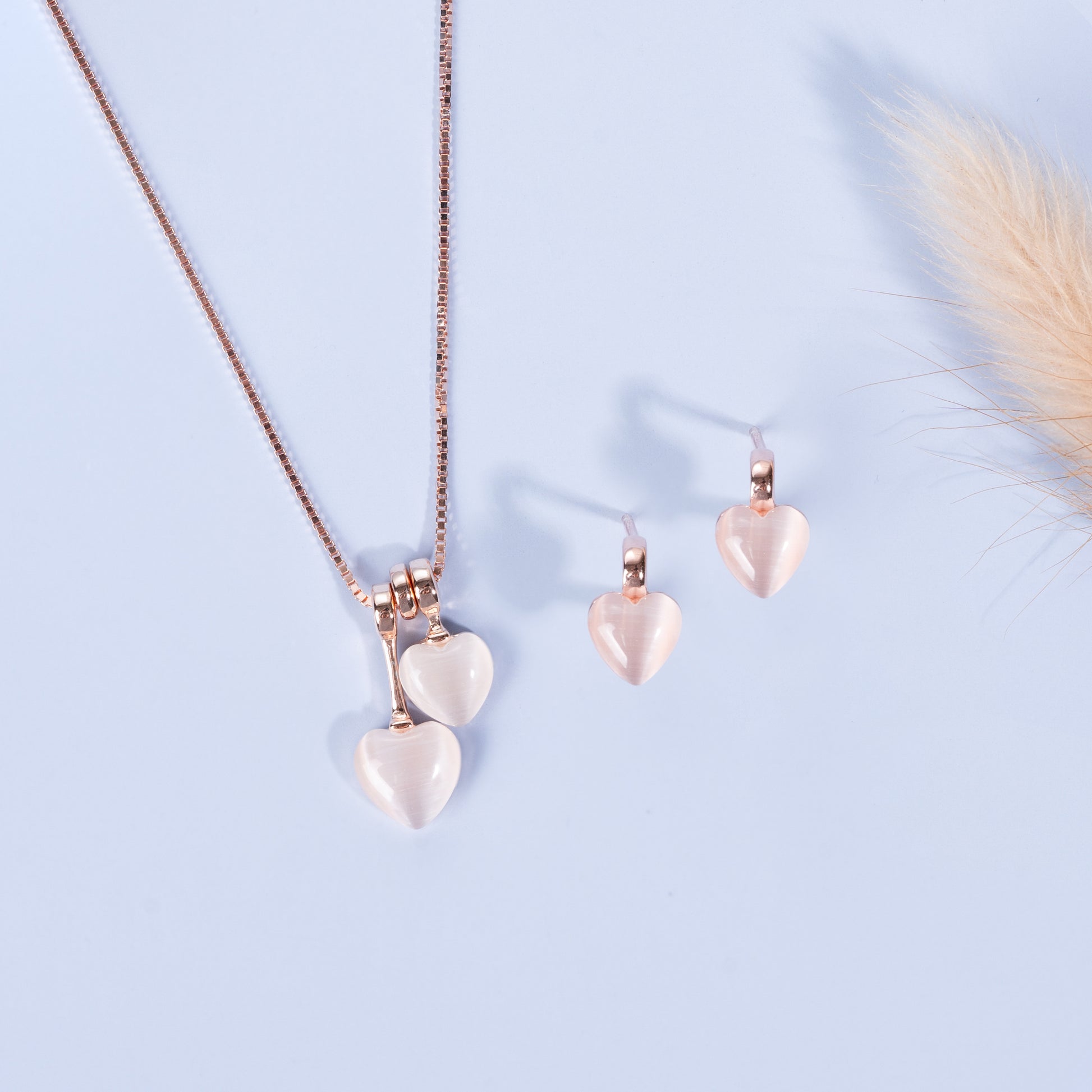 Delicately crafted in warm rose gold, the Blush Heart Harmony Set celebrates the language of love with soft blush-hued heart charms. The dainty pendant features a duo of hearts symbolizing togetherness, perfectly paired with matching earrings for a look that’s tender yet timeless. Ideal for romantic gifting or adding a gentle glow to your everyday style.