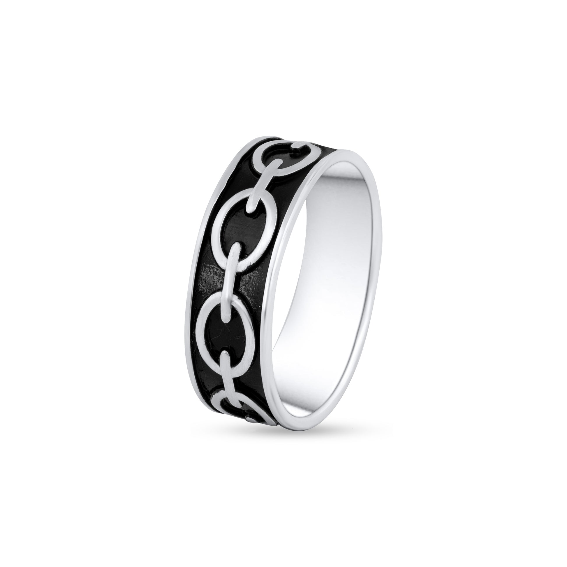 The Bound Link Ring embodies unity and resilience with its interlocking chain motif set against a sleek black enamel background. Expertly crafted in 92.5 sterling silver, this bold design symbolizes strength, connection, and enduring style — perfect for the man who values both power and purpose.