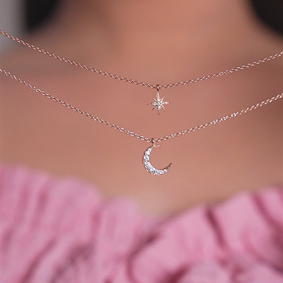 Shine bright with the Celestial Duo Necklace, featuring a rose gold-plated 92.5 sterling silver design with a radiant star and sparkling crescent moon. A cosmic-inspired layered piece that brings elegance and magic together.