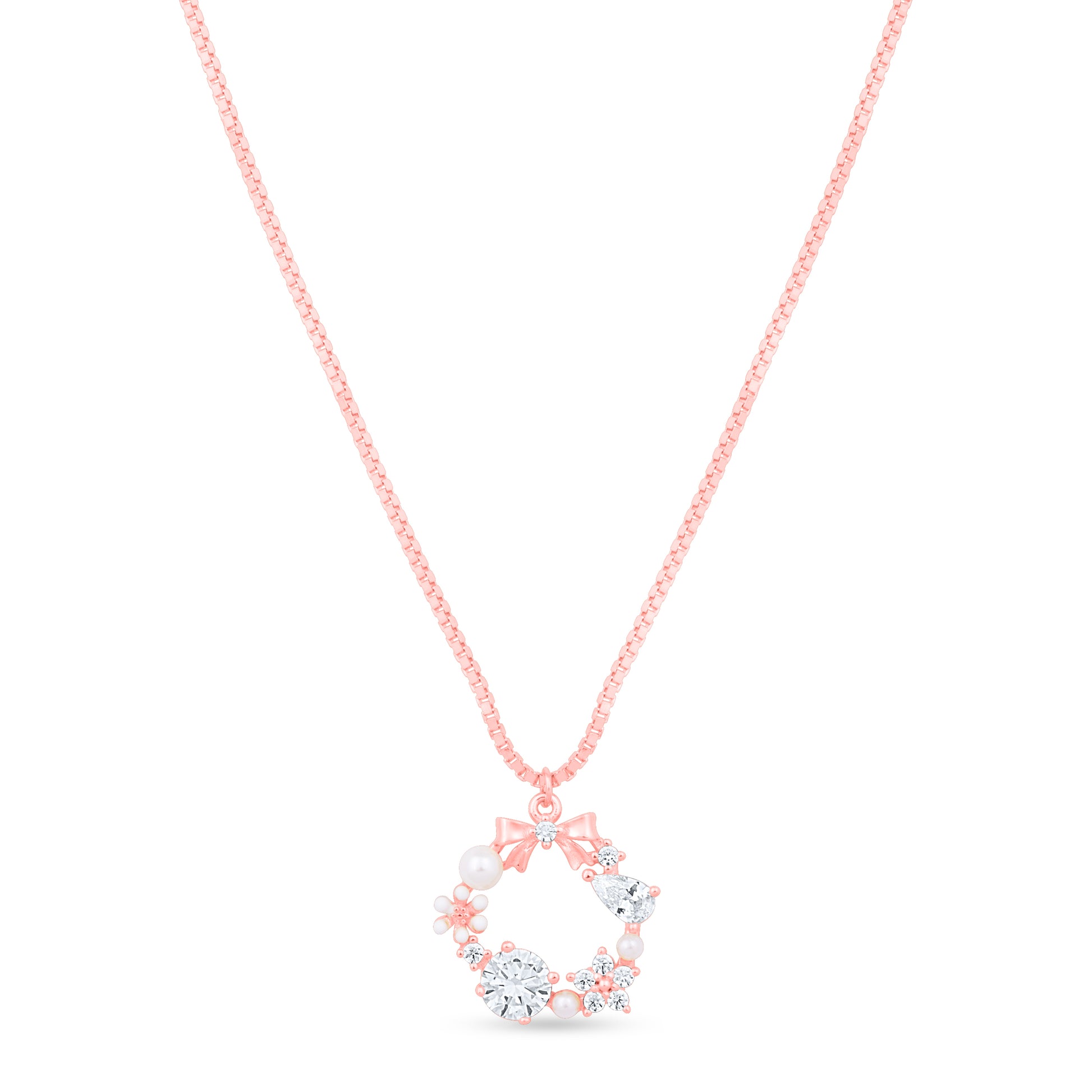 Read moreWhimsical and elegant, the Charm Bloom Pendant is crafted in 92.5 sterling silver and available in rhodium, gold, and rose gold finishes. Adorned with shimmering stones, delicate florals, pearls, and a sweet bow—this heart-shaped pendant is a graceful symbol of joy and femininity.