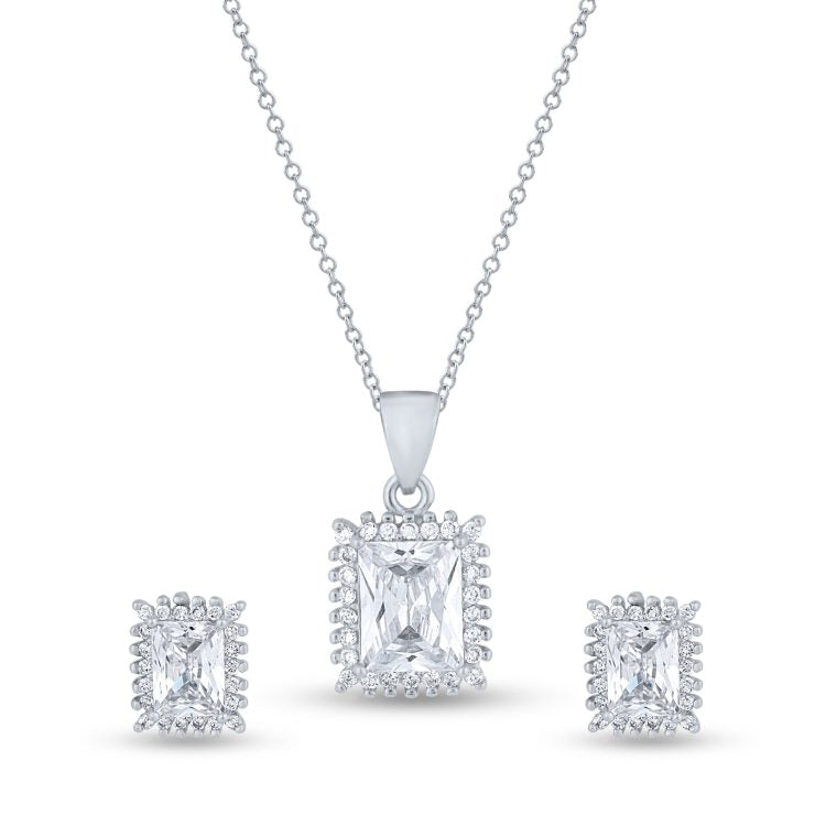 This exquisite set features a pair of elegant stud earrings and a matching pendant necklace, each centered around a brilliantly clear, rectangular gemstone that captures the essence of contemporary elegance.