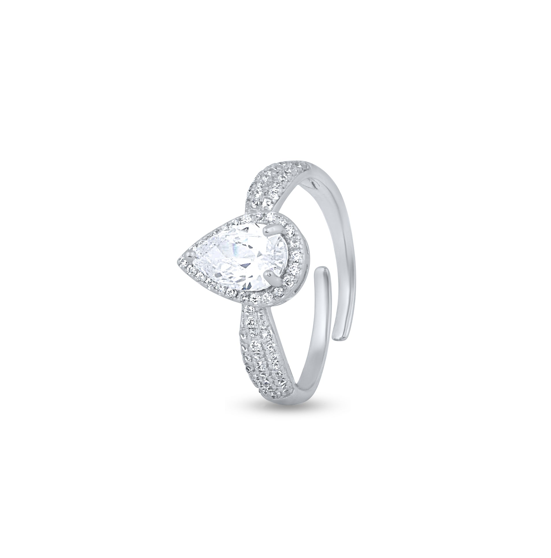 This ring, named the "Crystal Orbit Ring," is a testament to fine craftsmanship and elegant design. It features a striking teardrop-shaped central gem that captures the essence of refined beauty, encircled by a swirl of sterling silver that mimics the motion of an eclipse.