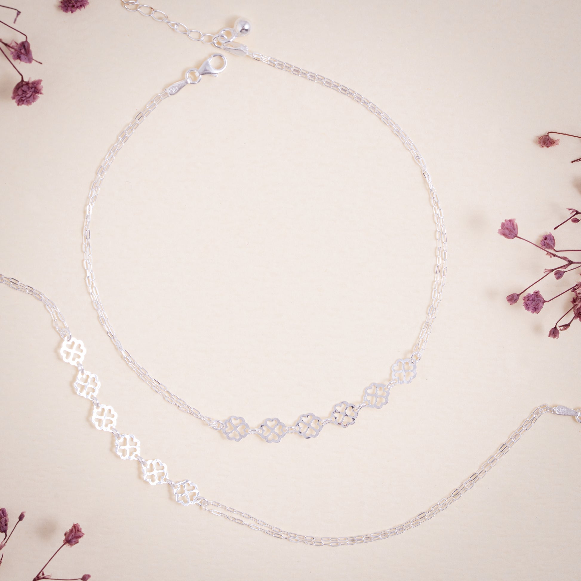 Graceful and delicate, the Ethereal Link Anklet is crafted in 92.5 sterling silver with a fine chain and a series of airy geometric links at its center. Its subtle sparkle and minimal design make it a perfect everyday accessory, while the adjustable clasp ensures a comfortable fit. A refined piece that brings a touch of elegance to any look.