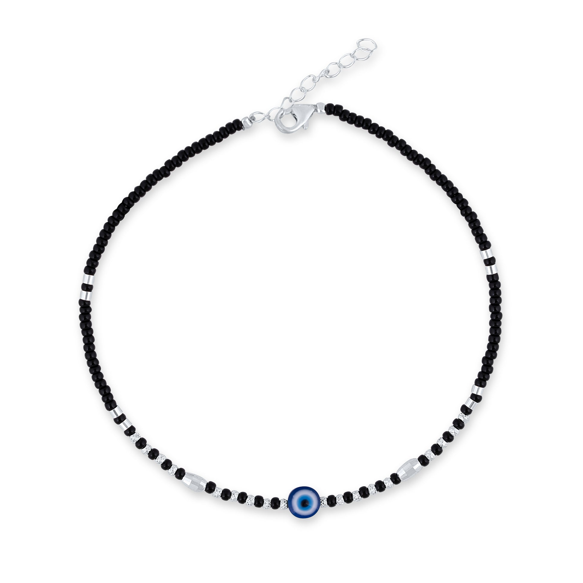 Keep negativity at bay with the Evil Eye Guard Anklet, designed with sleek black beads and shimmering silver accents. The central blue evil eye charm adds a protective aura while enhancing your style with its striking contrast. Lightweight and adjustable, this anklet is perfect for daily wear—bringing together tradition, elegance, and a touch of mystique in one statement piece.