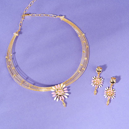 The earrings showcase a stylized floral pattern with alternating white and light pink petals, while the necklace features a beautiful floral-inspired pendant with pink and cream-colored enamel or gemstone inlays, all set against a delicate gold chain.