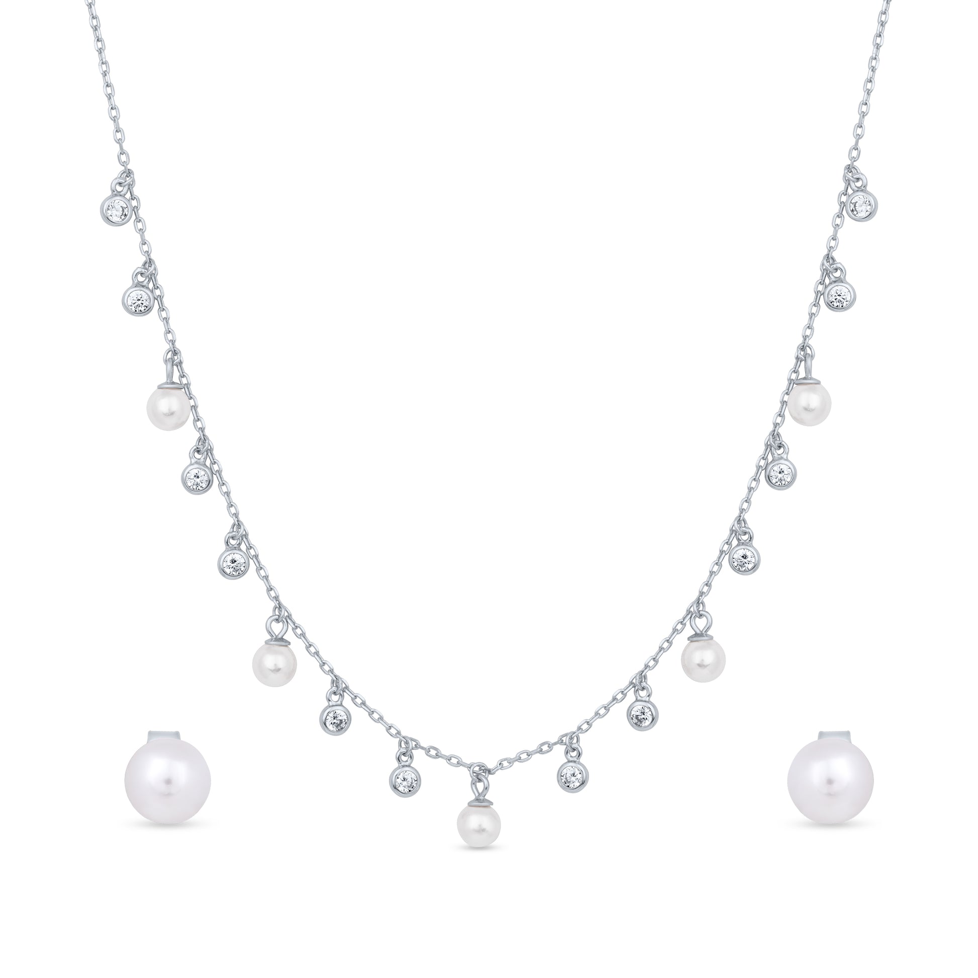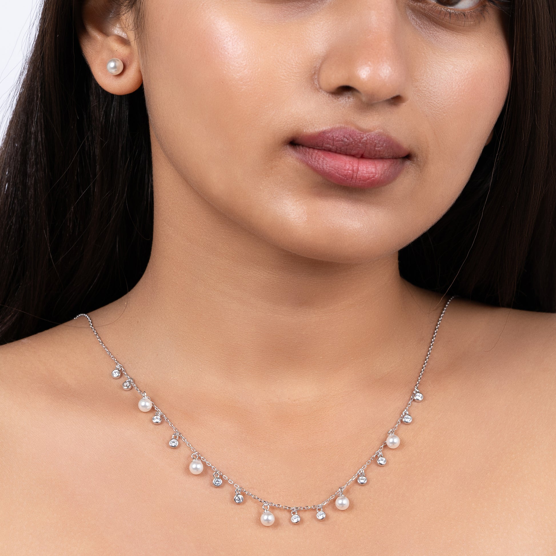 The Pearl Dewdrop Set is a delicate blend of grace and radiance. Crafted in rose gold-plated sterling silver, this elegant set features a cascading design of lustrous pearls and sparkling zircon stones, resembling fresh morning dewdrops. The matching pearl stud earrings complete the timeless look, making this set a perfect choice for effortless elegance, whether for a romantic evening or a touch of everyday luxury.
