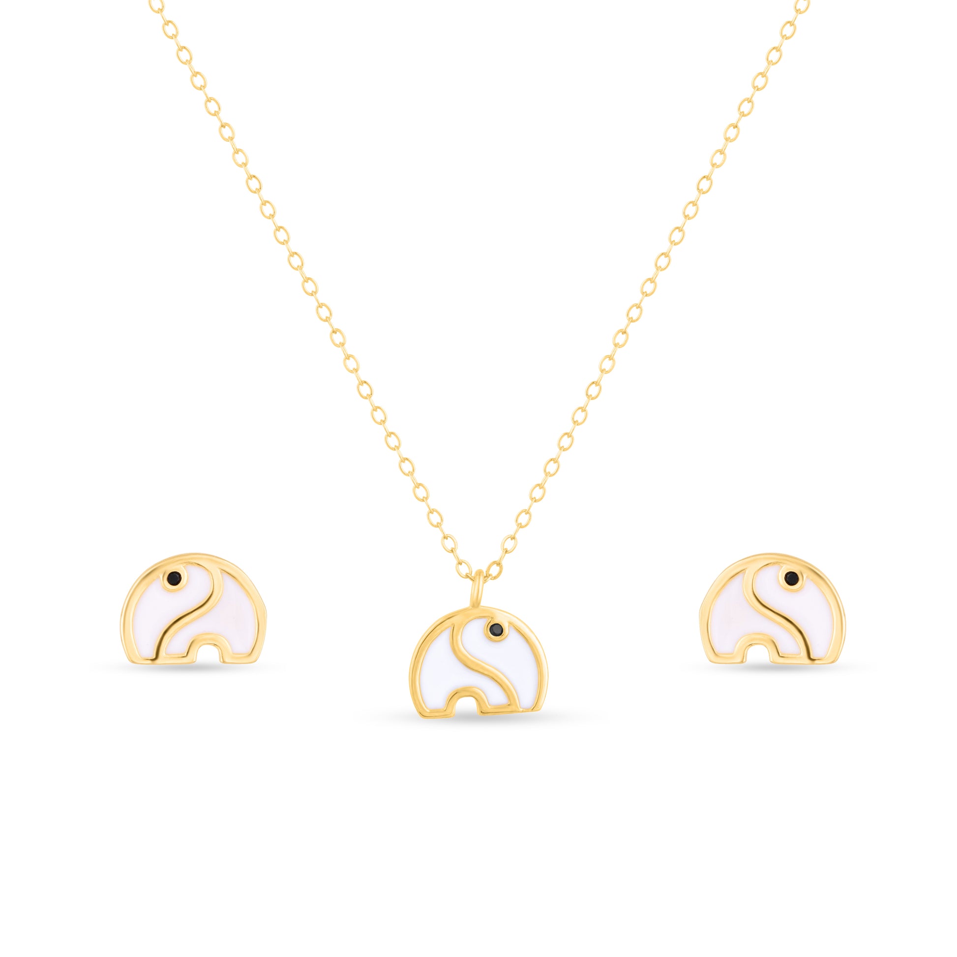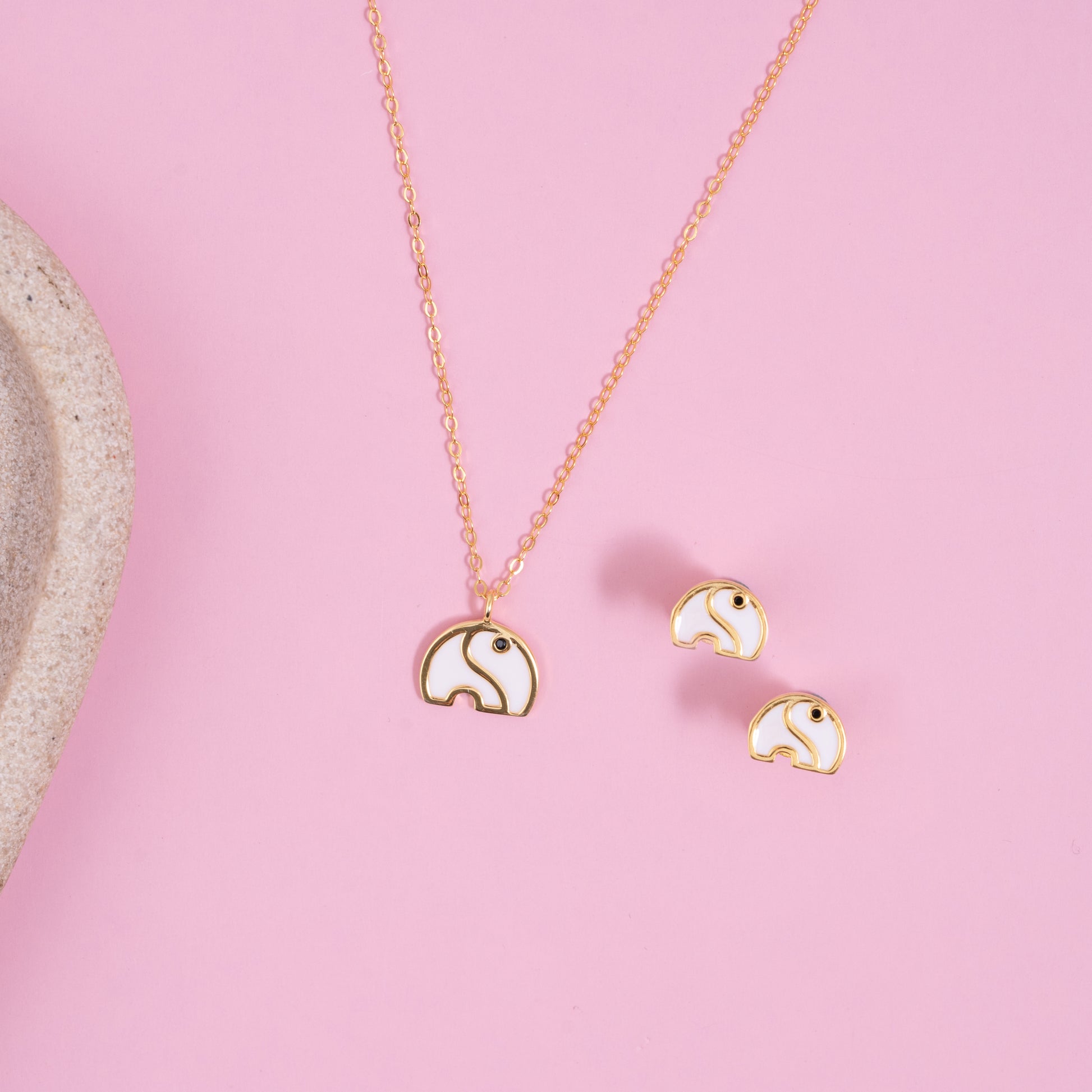 The Golden EleGlow Set is a charming fusion of elegance and positivity. Crafted in 92.5 sterling silver with a radiant gold finish, this delightful set features a cute elephant pendant paired with matching stud earrings. The smooth white enamel detailing and tiny black stone eye add a touch of character and symbolism — representing wisdom, protection, and good fortune. Light, joyful, and stylish, this set is perfect for gifting, daily wear, and bringing a little bit of luck everywhere you go.