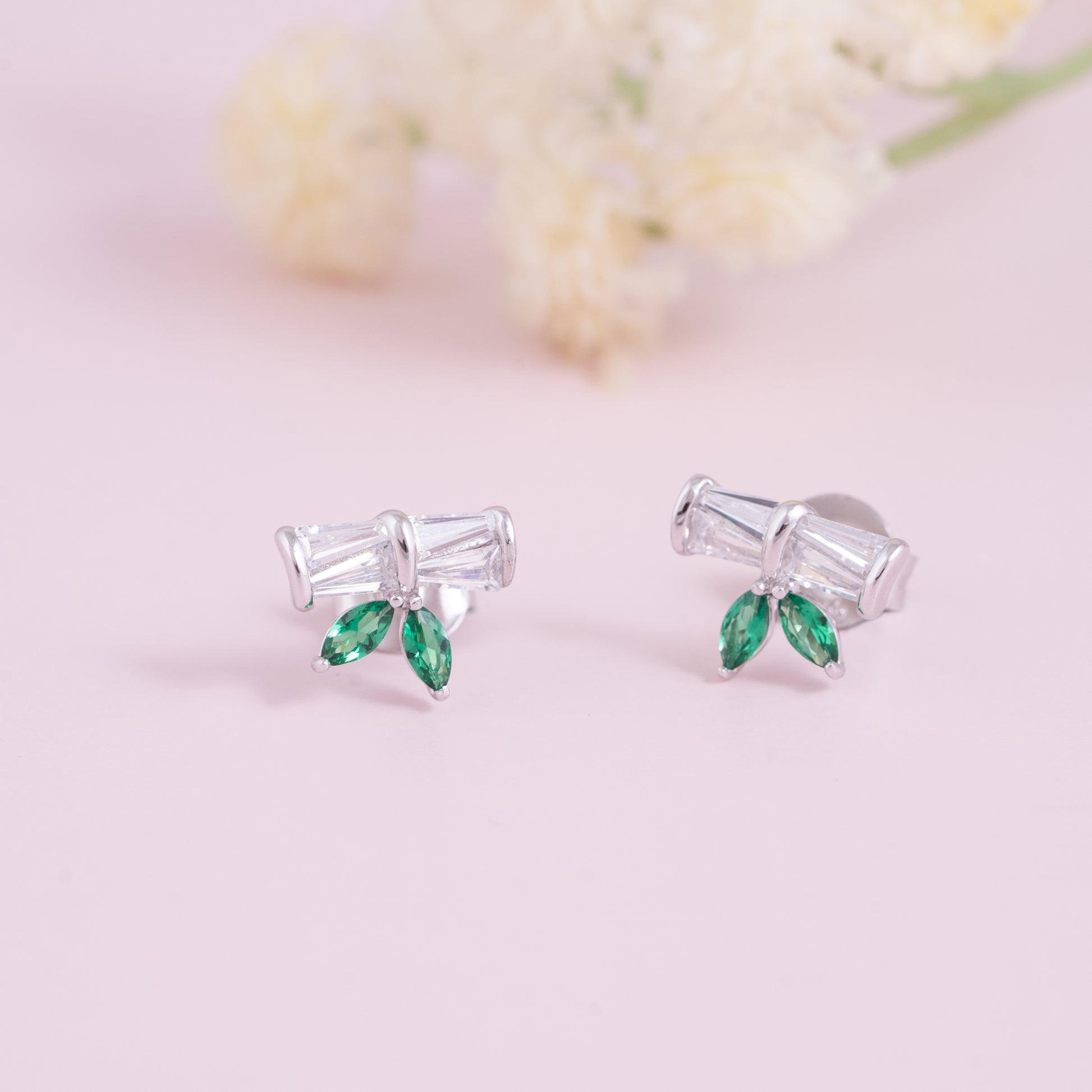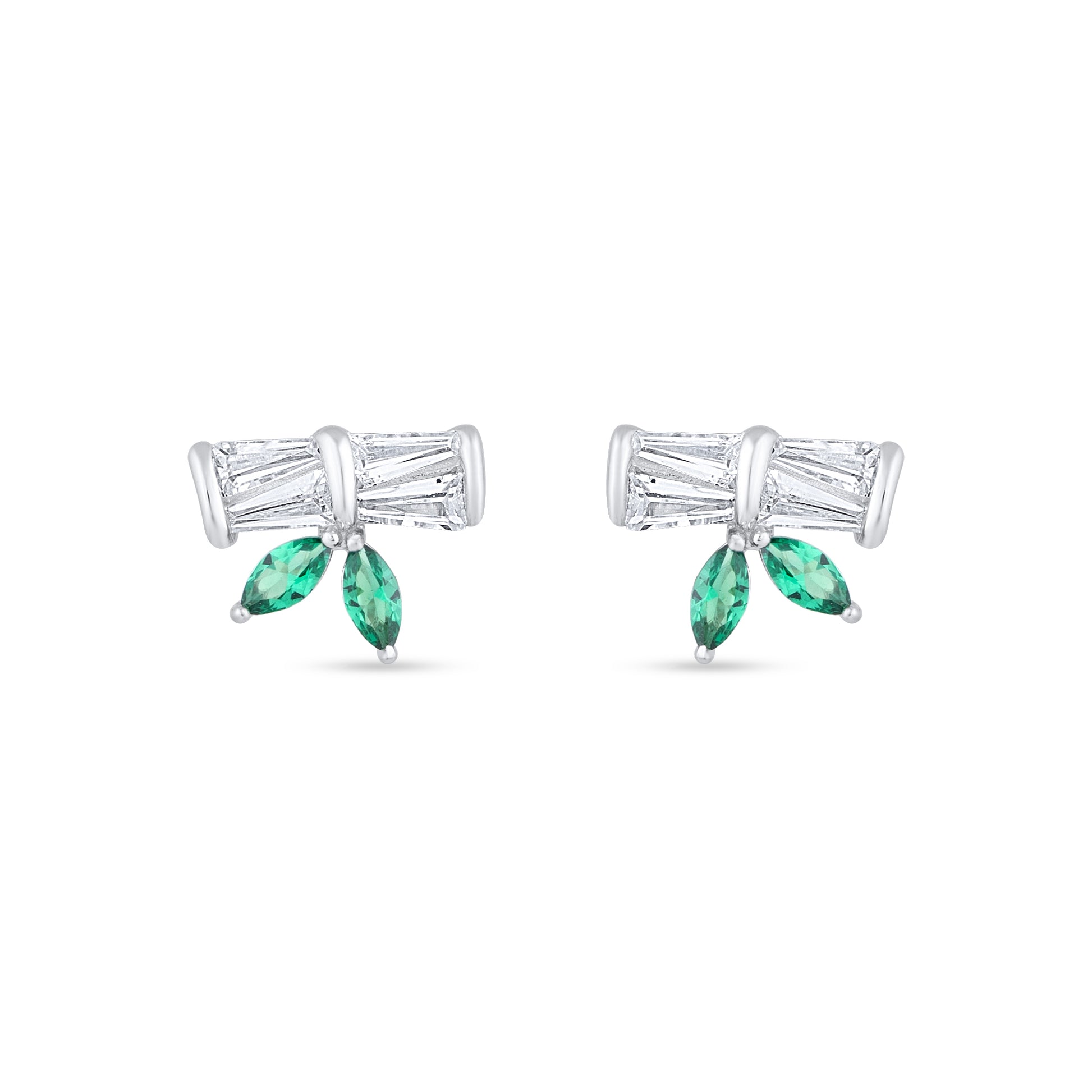 The Greenlight Gleam Studs bring together nature’s charm and modern sparkle. Crafted in 92.5 sterling silver, these elegant earrings feature baguette-cut white stones paired with twin marquise-cut green gemstones that resemble delicate leaves. Radiant and refreshing, they add a graceful touch of color and sophistication — perfect for both daily wear and special occasions.