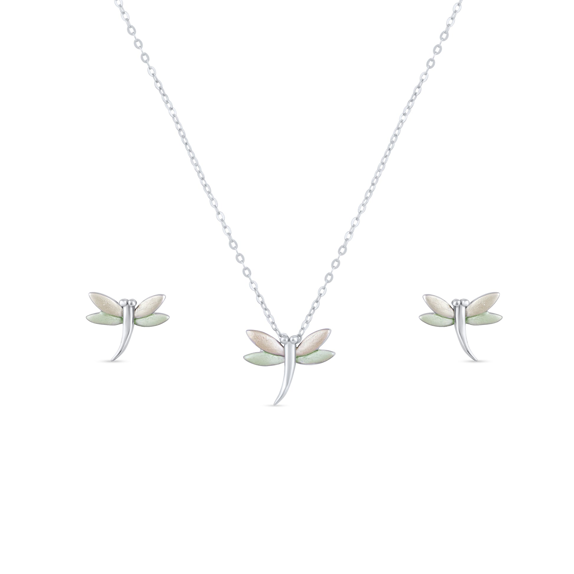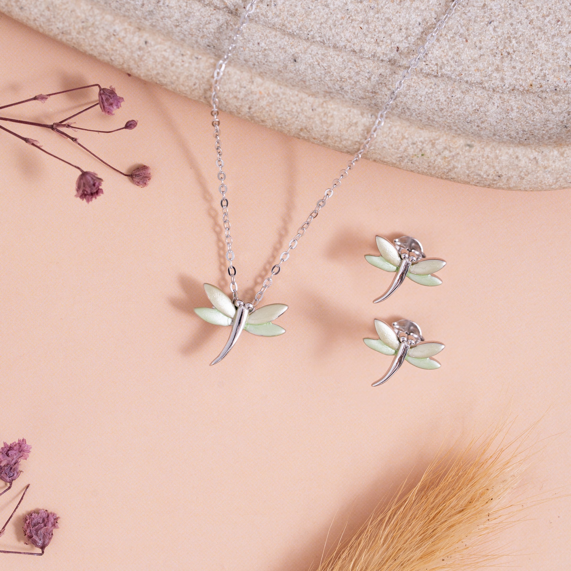 Graceful and enchanting, the Mint Wing Dragonfly Set captures the delicate beauty of nature in every detail. Crafted in 92.5 sterling silver, this pendant and earring set features elegant dragonflies with soft mint enamel wings and polished silver bodies. Perfect for kids and nature lovers alike, it adds a touch of freshness and whimsy to any outfit. Lightweight and timeless, this set is a lovely choice for everyday wear or as a charming gift.