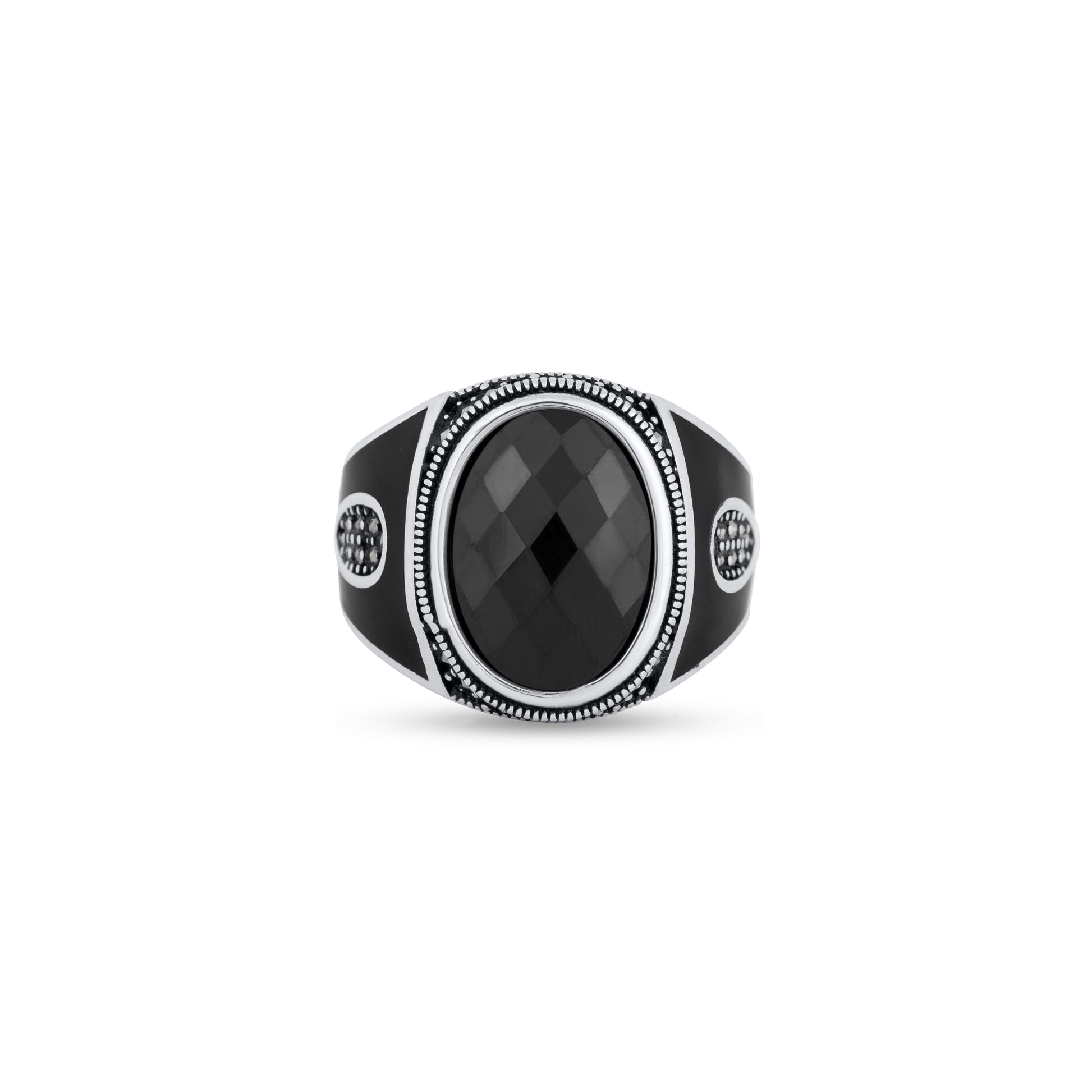 Commanding and timeless, the Onyx Regent Ring exudes power through its bold faceted black gemstone set in 92.5 sterling silver. The intricate oxidized detailing along the band adds depth and heritage-inspired charm, perfectly complementing the stone’s dark sheen. Crafted for the man who embodies confidence and authority, this ring is a mark of refined dominance and understated luxury.