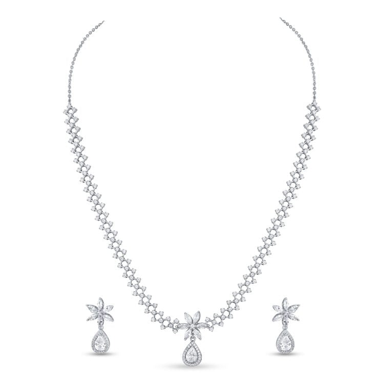 Featuring intricately designed floral motifs accented with radiant teardrop elements, this set exudes grace and sophistication.