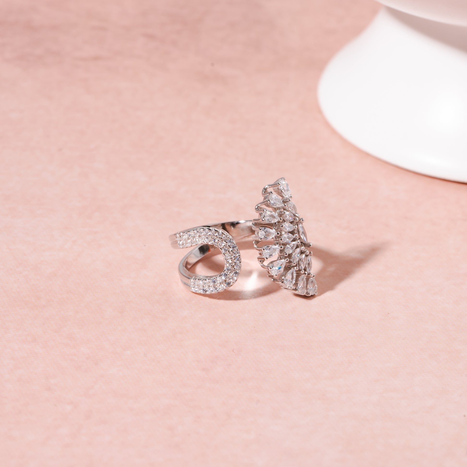 Make a statement with the Peacock's Pride Ring, a stunning piece of jewelry that showcases the beauty of diamonds in a unique and elegant design. This exquisite ring features a fan-shaped arrangement of diamonds, reminiscent of a peacock's tail, with a curved element that adds a touch of whimsy and... Read more