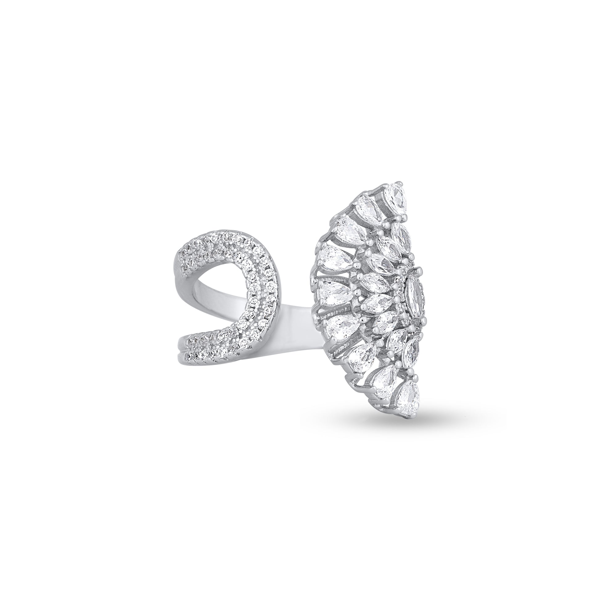 Make a statement with the Peacock's Pride Ring, a stunning piece of jewelry that showcases the beauty of diamonds in a unique and elegant design. This exquisite ring features a fan-shaped arrangement of diamonds, reminiscent of a peacock's tail, with a curved element that adds a touch of whimsy and sophistication. The diamonds are carefully set in a graduated pattern, creating a sense of depth and dimension that is sure to turn heads. The ring's band is crafted from white gold or platinum, providing a sleek and modern contrast to the vintage-inspired design. Whether you're looking for a special occasion ring or a luxurious accessory to elevate your everyday style, the Peacock's Pride Ring is a true showstopper that is sure to impress.
