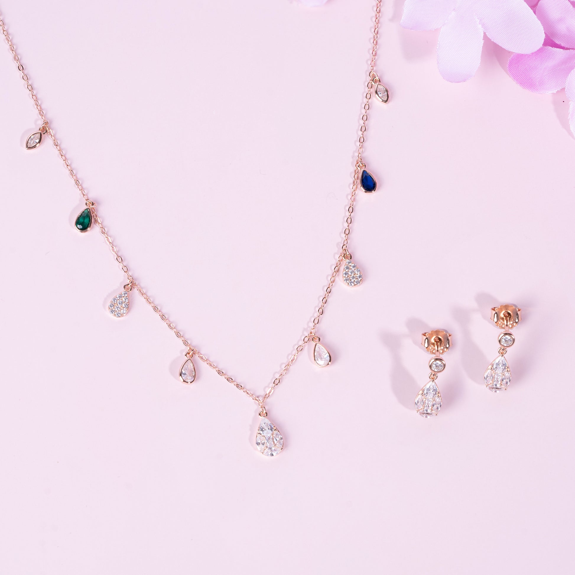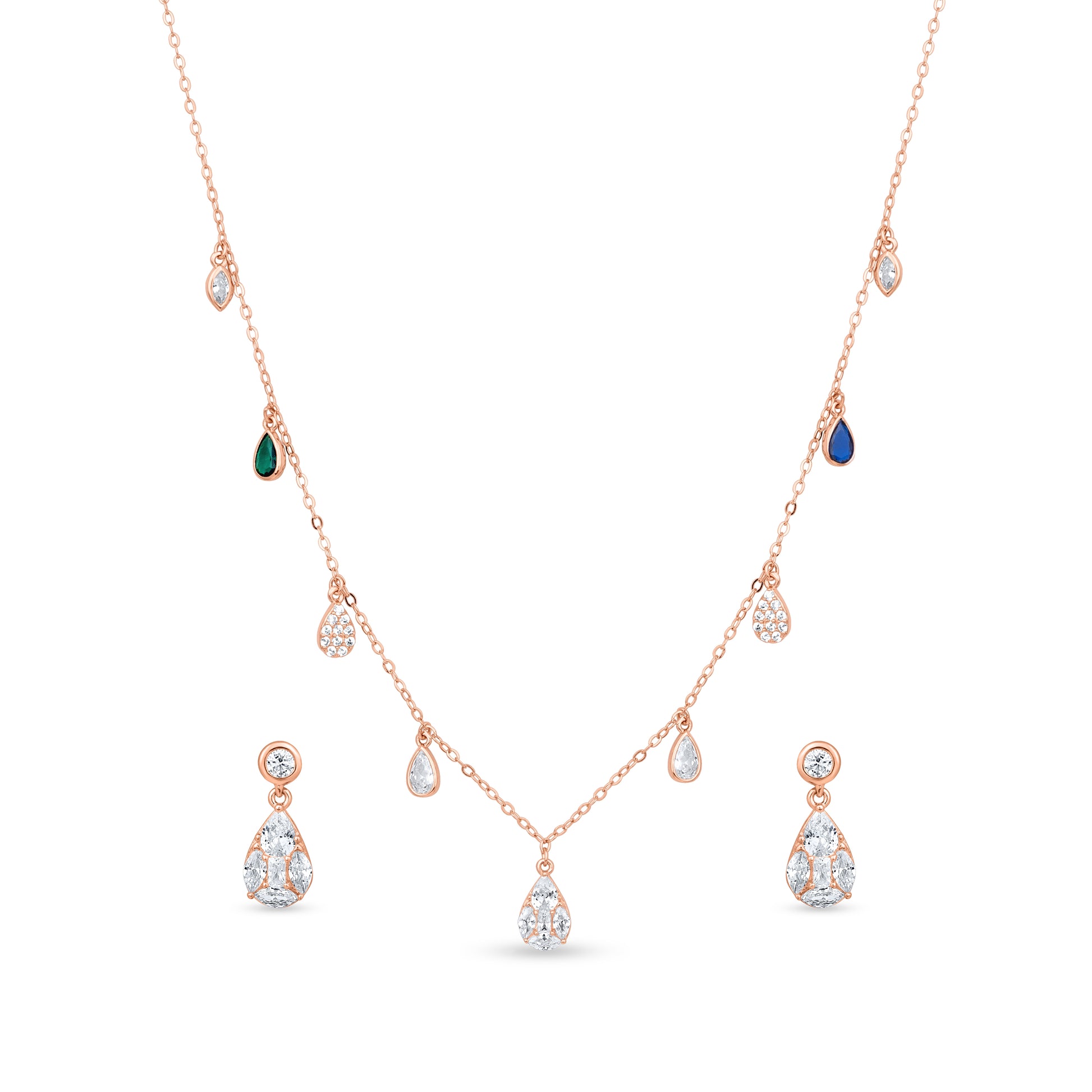 The Raindrop Sparkle Set is a delicate combination of a shimmering necklace and matching earrings, inspired by the beauty of falling raindrops. Adorned with sparkling teardrop-shaped stones and accented with subtle hints of green and blue, this elegant set adds a touch of sophistication to any look. Perfect for special occasions or adding a graceful charm to everyday wear.
