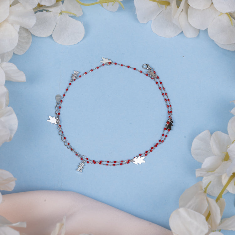 Rory is a chic little anklet that pops in the daylight with its red beads and silver add-ons. A quirky piece to make a boring outfit stand out.