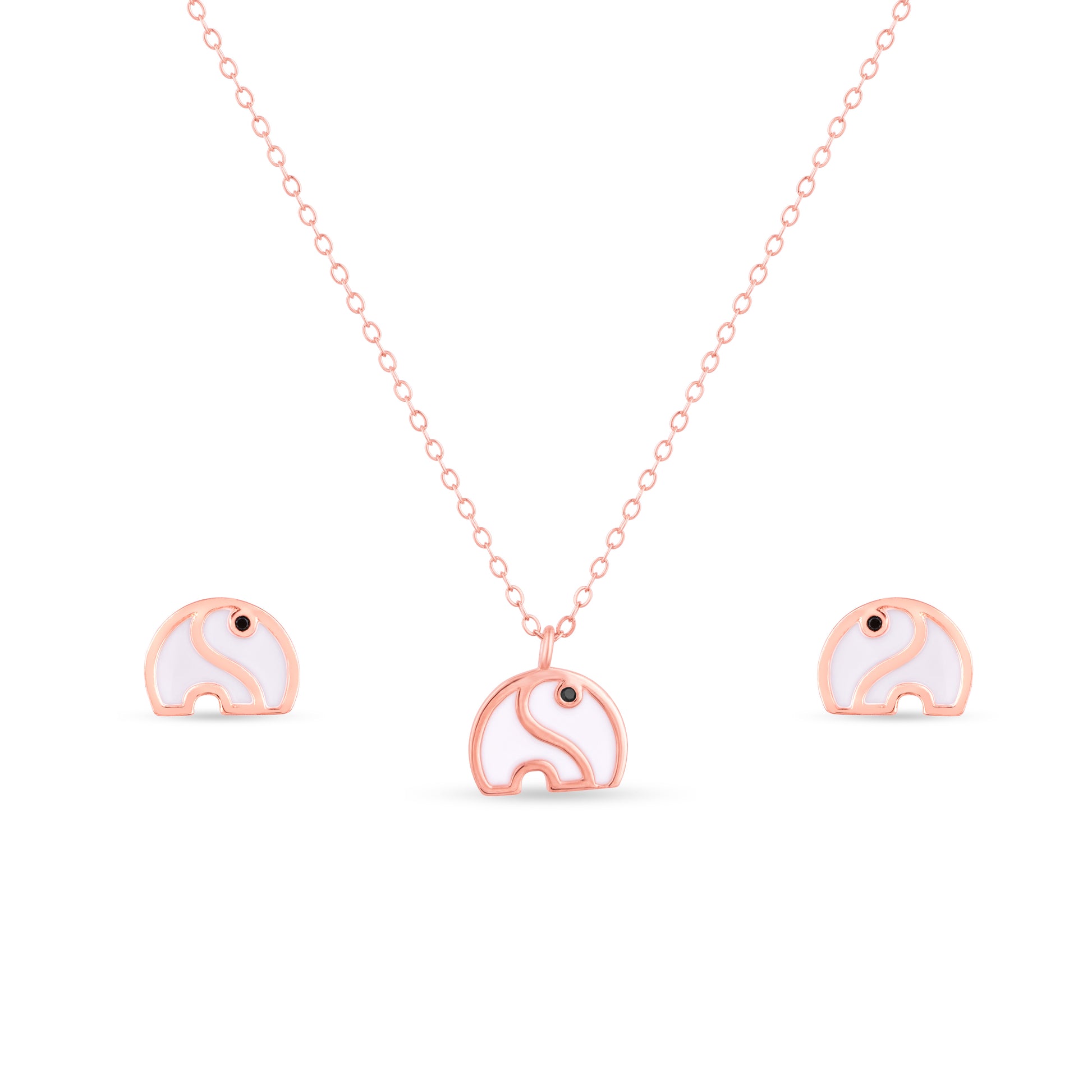 The EleGlow Set brings playful elegance to everyday fashion with its adorable elephant-shaped design. Crafted in 92.5 sterling silver with a soft rose-gold finish, the set includes a charming pendant necklace and matching stud earrings. The smooth white enamel body and tiny black stone eye add personality... Read more