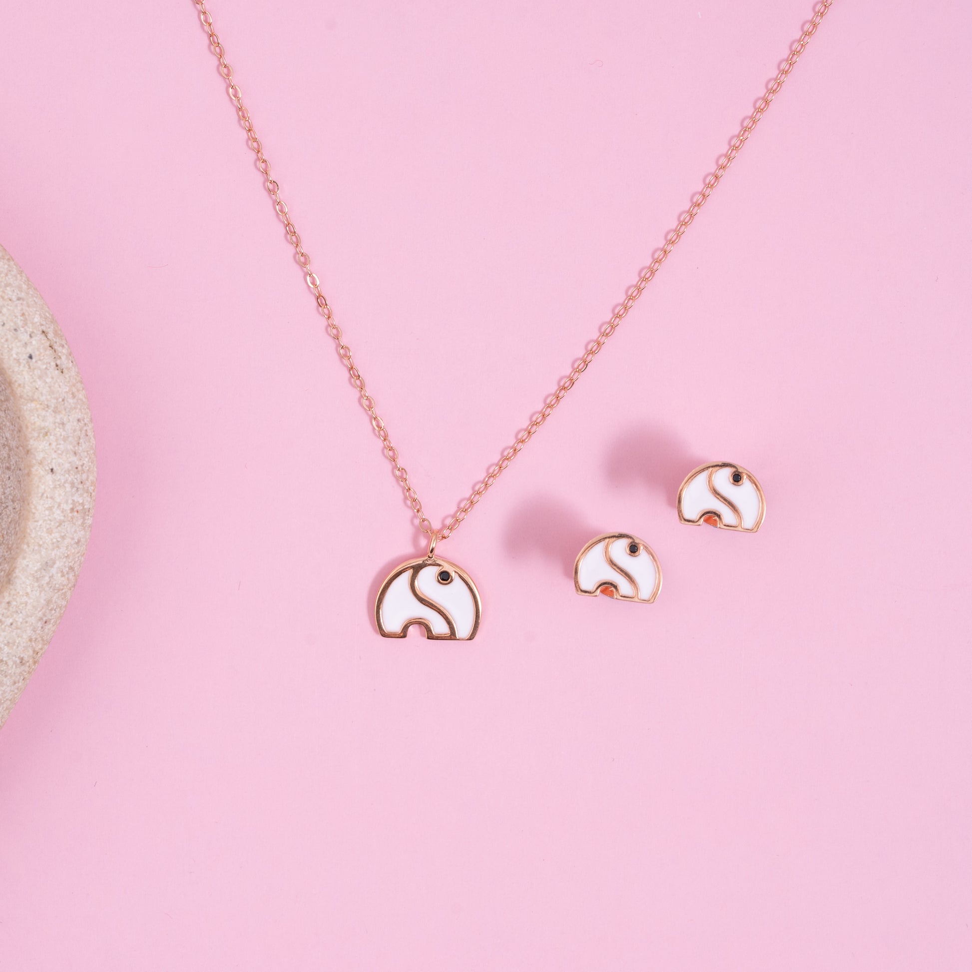 The EleGlow Set brings playful elegance to everyday fashion with its adorable elephant-shaped design. Crafted in 92.5 sterling silver with a soft rose-gold finish, the set includes a charming pendant necklace and matching stud earrings. The smooth white enamel body and tiny black stone eye add personality and warmth, symbolizing good luck, wisdom, and positivity. Light, cute, and beautifully refined — perfect for daily wear, thoughtful gifting, or adding a joyful touch to any outfit.