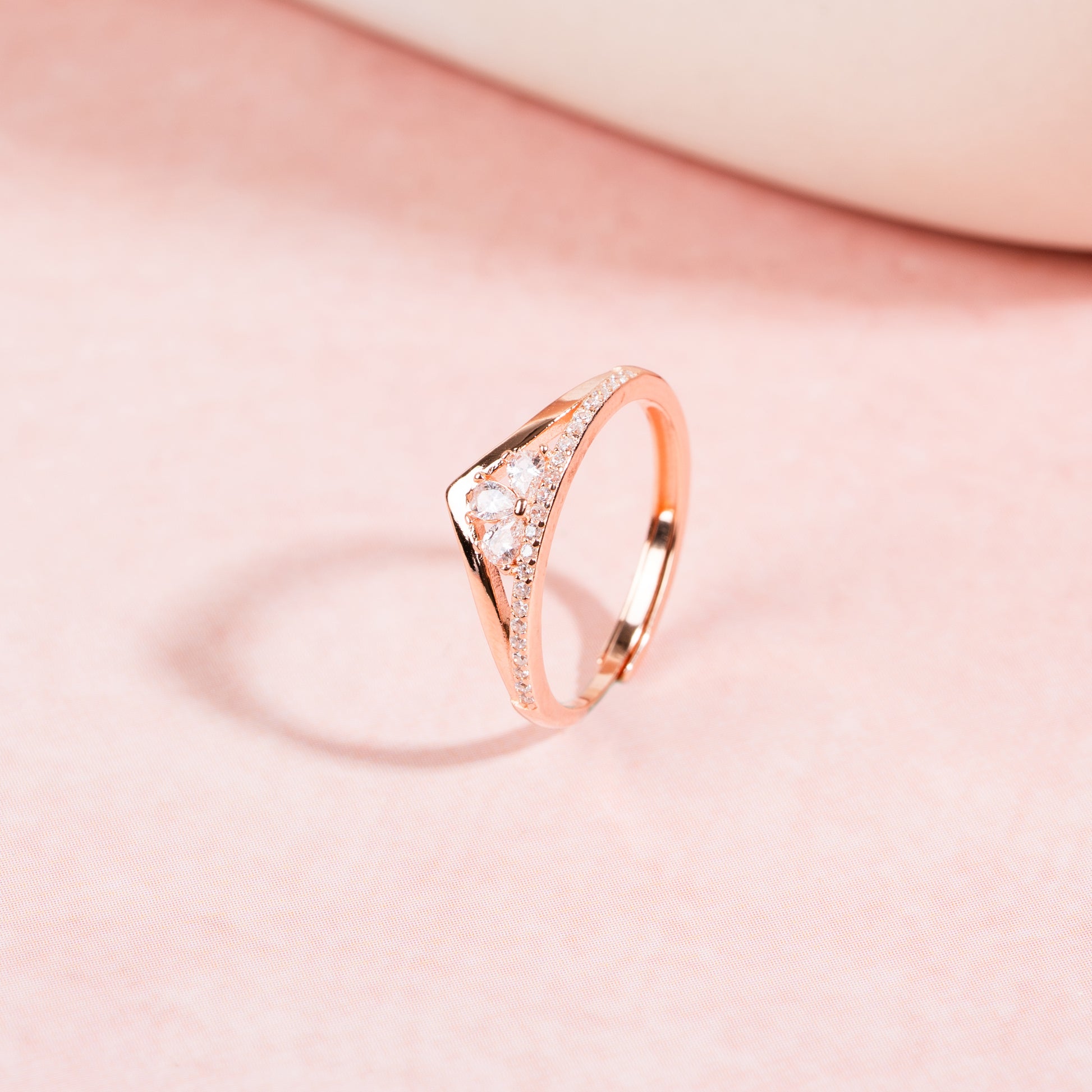 The Rose Starlight Curve Ring glimmers with elegance and poise. Crafted in rose gold plated 92.5 sterling silver, its V-shaped design is accentuated by a radiant pear-cut centerpiece framed with delicate sparkling stones. This refined ring captures the essence of celestial beauty, making it a graceful choice for both daily wear and special occasions.