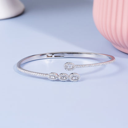 A sophisticated sterling silver bangle featuring an open-ended design adorned with shimmering baguette-cut stones and a halo of brilliant crystals. A timeless statement piece for modern elegance.