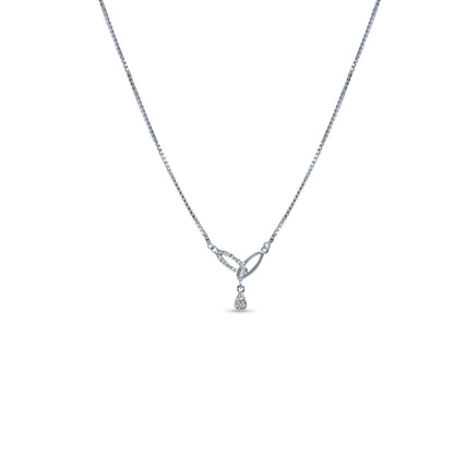 Crafted with a base metal of 925 sterling silver, the necklace showcases a centrepiece, delicately crafted with two leaflet-like structures, one adorned with sparkling zircons, and a graceful water-drop shaped zircon dangling below the centerpiece. This necklace embodies timeless beauty and refined elegance, making it the perfect accessory for any occasion.