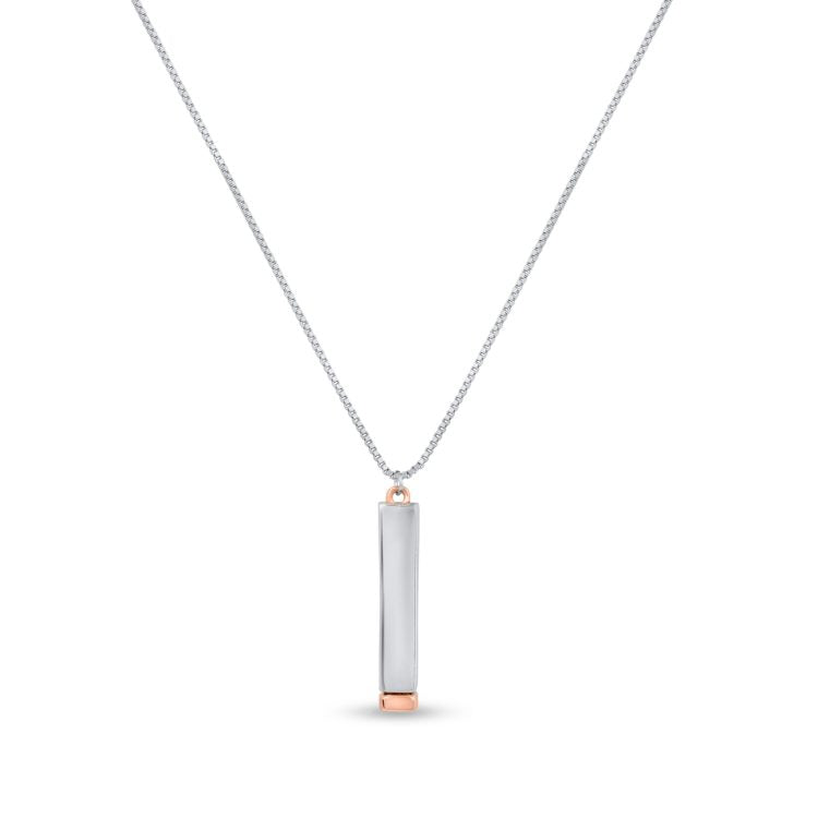 This necklace features a slender cylindrical pendant crafted in polished sterling silver, capped with a touch of rose gold that adds a subtle contrast and warmth to its overall look.