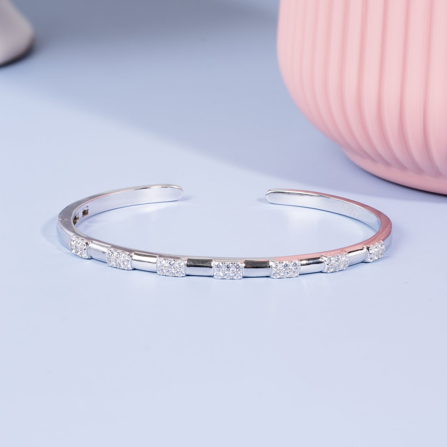 A sleek sterling silver open cuff bangle featuring a modern bar design with sparkling crystal accents. A refined piece that blends minimalism with timeless elegance.