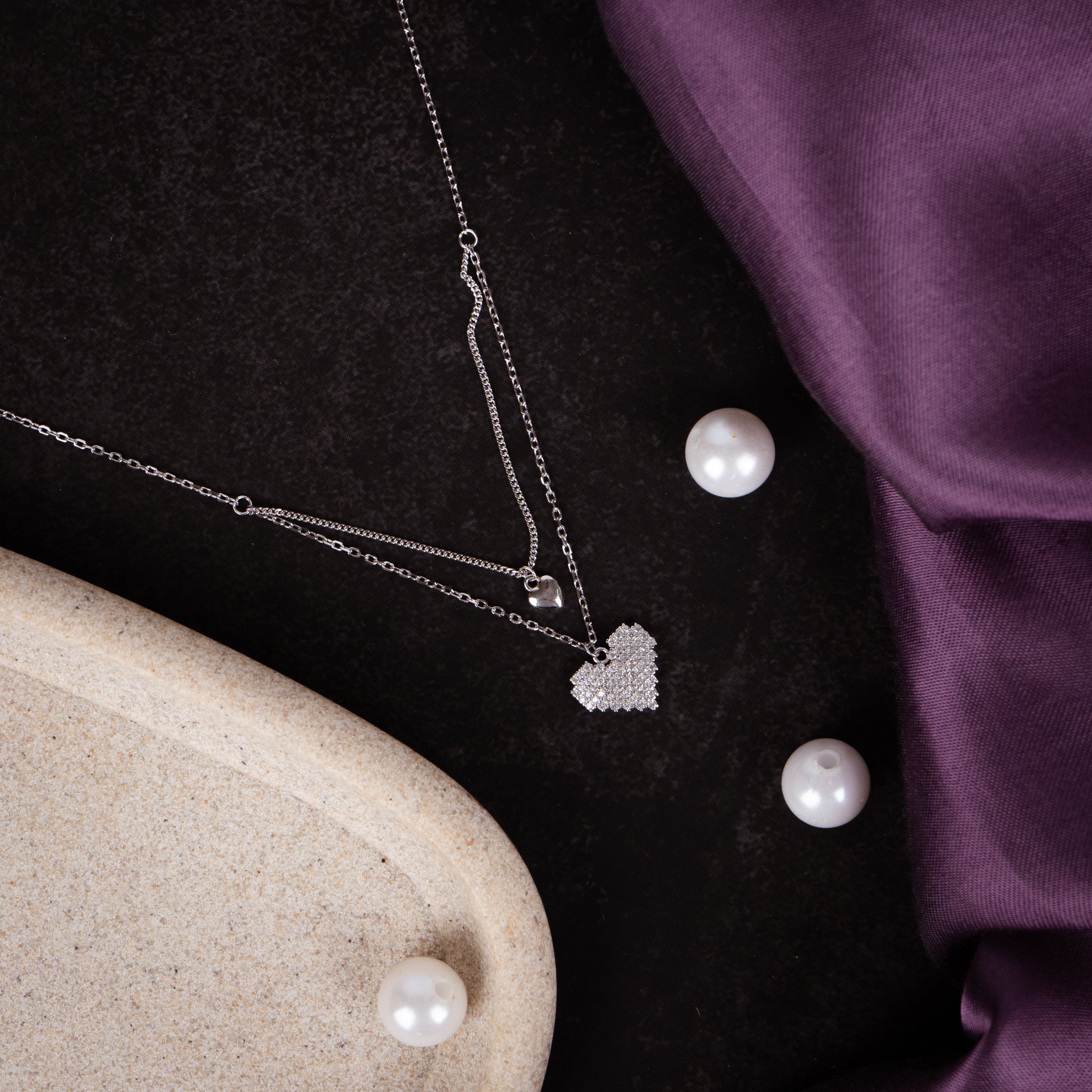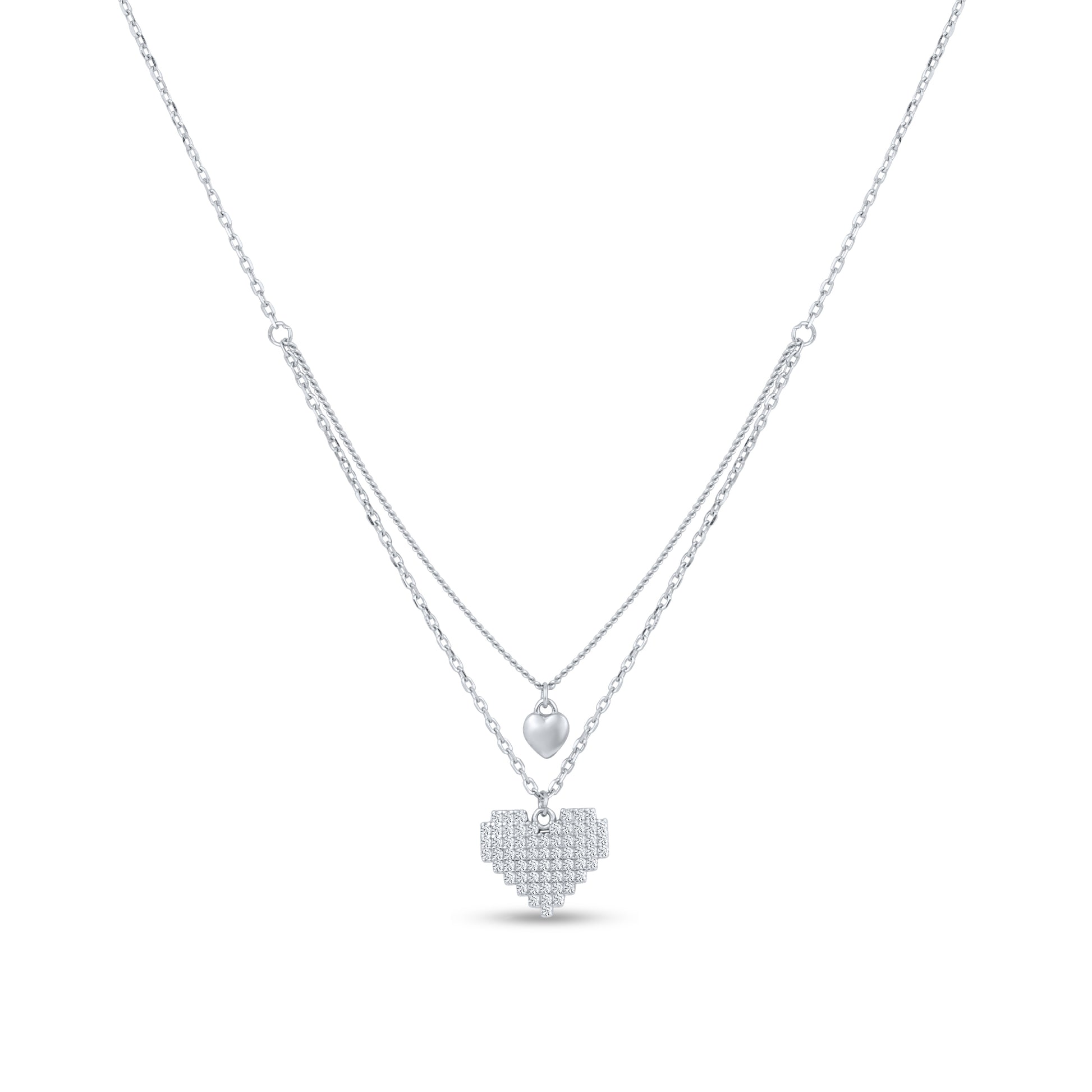 This elegant necklace is made of sterling silver and features two chains with heart-shaped pendants. It's a classic piece that will never go out of style.