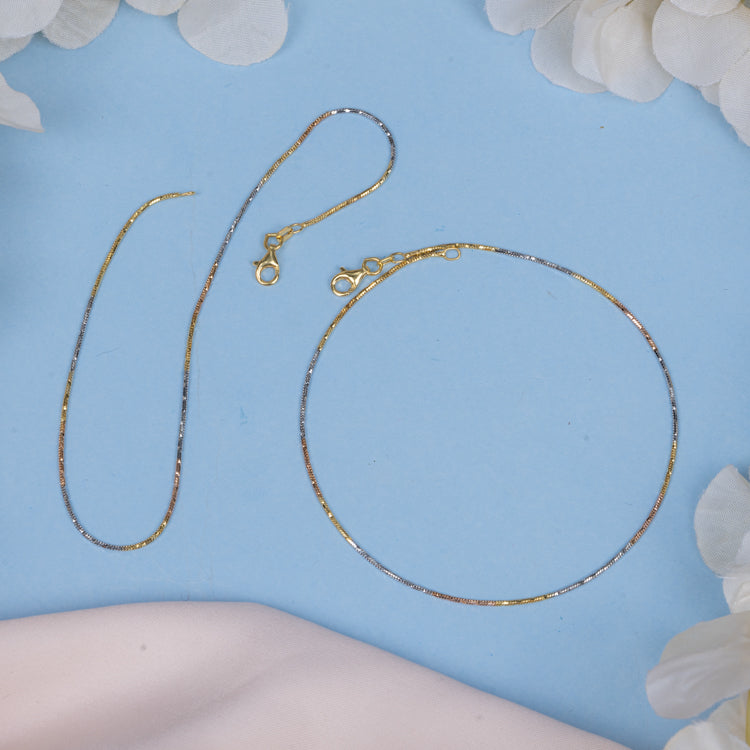 With a color akin to that of the winter golden hour, this golden set of anklets is an evergreen pick for any jewel box. The twisted design with silver cutlines in between gives the anklet a dynamic look. Crafted out of premium quality metal (925 certified pure silver), the pair ensures hassle-free style every day with an allure that is timeless.